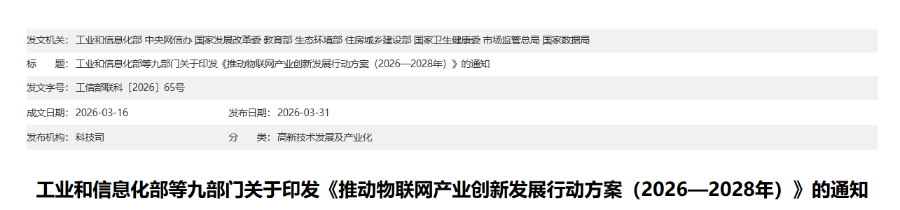 工业和信息化部等九部门关于印发《推动物联网产业创新发展行动方案(2026—2028年)》的通知