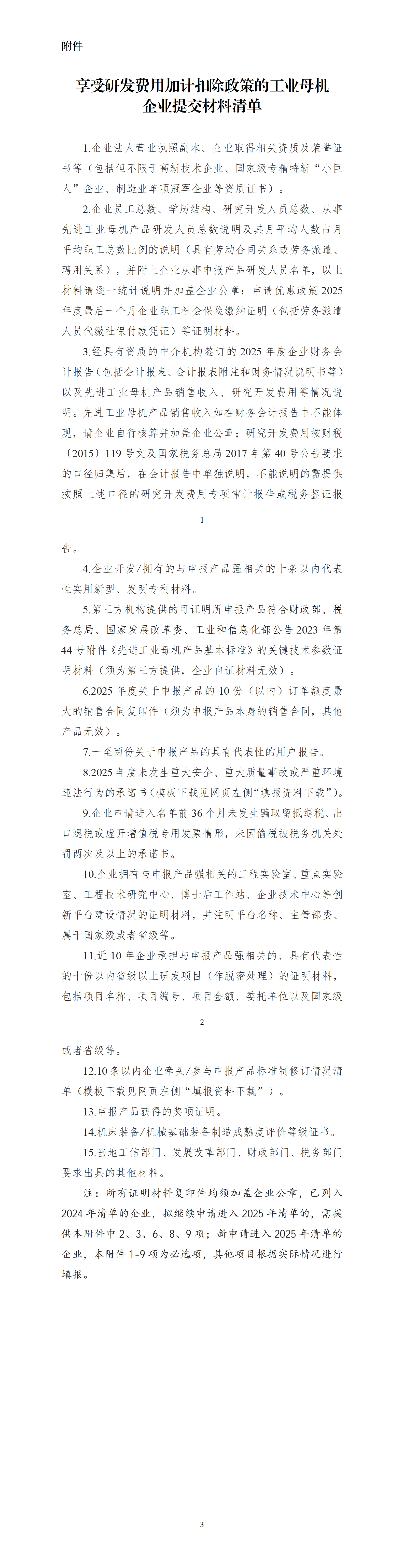 根据《财政部 税务总局 国家发展改革委 工业和信息化部关于提高集成电路和工业母机企业研发费用加计扣除比例的公告》(财政部 税务总局 国家发展改革委 工业和信息化部公告2023年第44号)有关规定,为做好2025年度享受研发费用加计扣除政策的工业母机企业清单制定工作,现就相关事项通知如下: